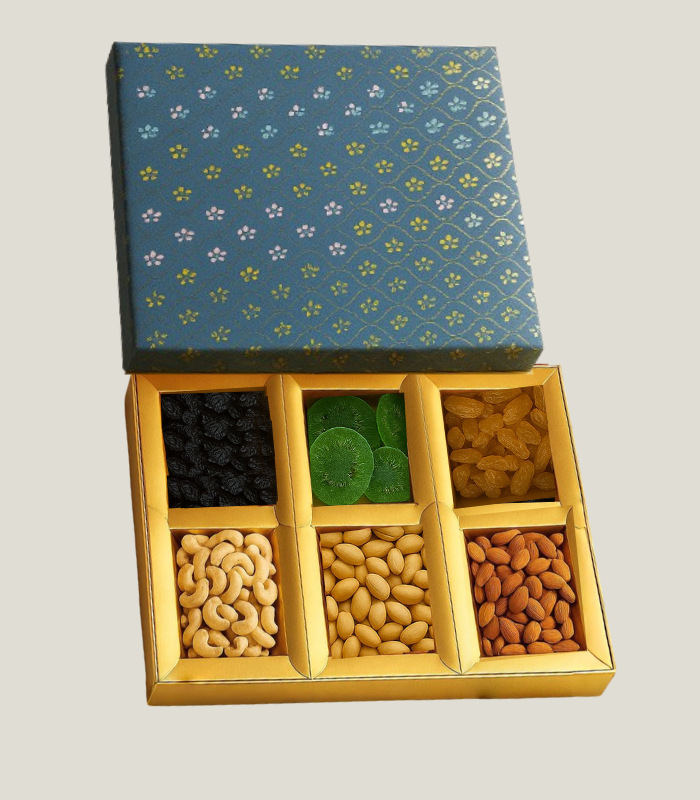 Experience regal flavors with the Royal Reserve Box. This premium hamper adds a bold twist with Black Raisins and a savory touch of salted nuts.