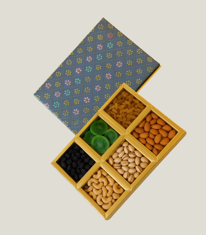 An elegant 4-compartment box featuring 100g each of premium Almonds, Cashews, Black Raisins, and Salted Pistachios. This set is designed for the connoisseur who appreciates rich textures and deep natural flavors. A sophisticated gift for festivals, anniversaries, or client appreciation.